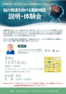 1月31日(土)、広島の「こどもウェルビーイング・クリニック“こころの小枝”」さんで、中川朋による『バイオフィードバック・ニューロモデュレーションー脳の発達を助ける、最新機器の説明・体験会ー』を開催します。